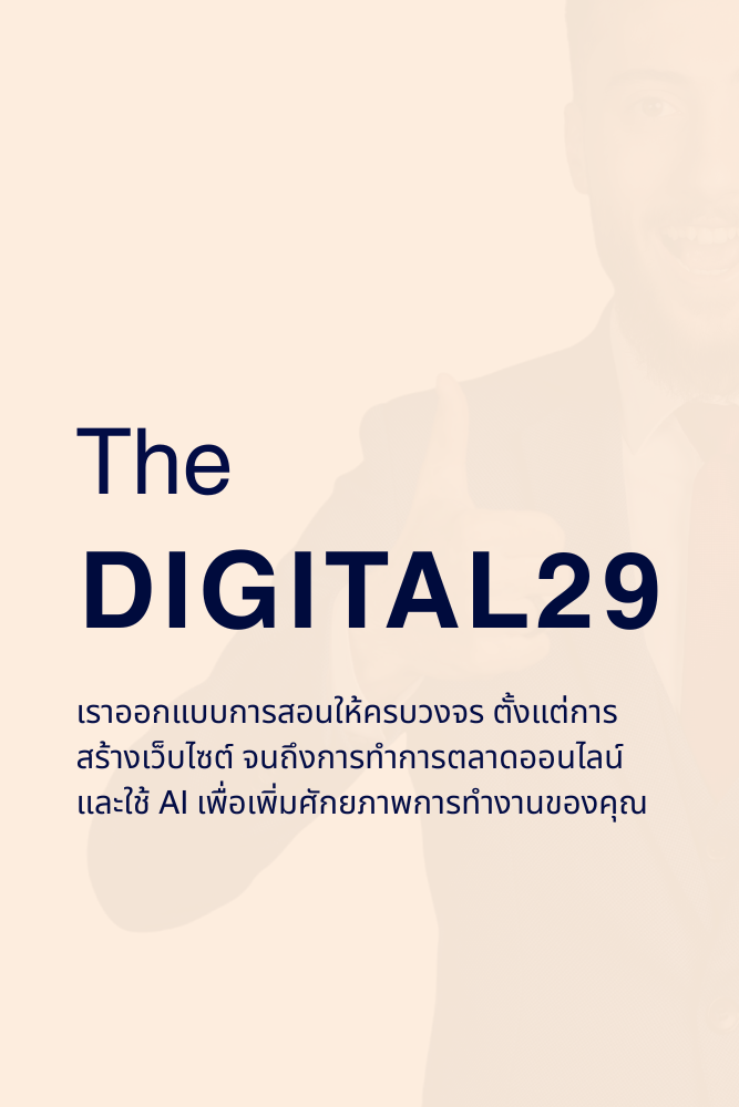 ที่ The Digital29 เราเชื่อว่าทักษะดิจิทัลคือกุญแจสำคัญที่จะเปิดประตูสู่โอกาสใหม่ในยุคออนไลน์ เราจึงสร้างหลักสูตรที่ครบวงจร ตั้งแต่การสร้างเว็บไซต์มืออาชีพด้วย WordPress และ Elementor การทำการตลาดออนไลน์ที่ได้ผลจริง ไปจนถึงการใช้ Facebook Ads อย่างแม่นยำ และการประยุกต์ใช้ AI เพื่อเพิ่มประสิทธิภาพการทำงานให้เร็วขึ้นและมีคุณภาพมากขึ้น
